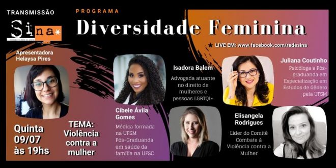 Nesta quinta-feira, 09 de Julho, o Diversidade Feminina retorna com o tema Violência Contra Mulher em uma Live ao vivo às 19h. Durante a quarentena, os índices de denúncia de violência doméstica aumentaram devido ao isolamento. Campanhas foram criadas, grupos de acolhimento foram mobilizados para dar suporte a mulheres que conseguiram agir neste momento duplamente difícil. Durante o Programa vamos conversar com diversas mulheres que atuam nesse sentido em Santa Maria. O programa é transmitido pelo Facebook da Rede Sina (www.facebook.com/redesina/).
