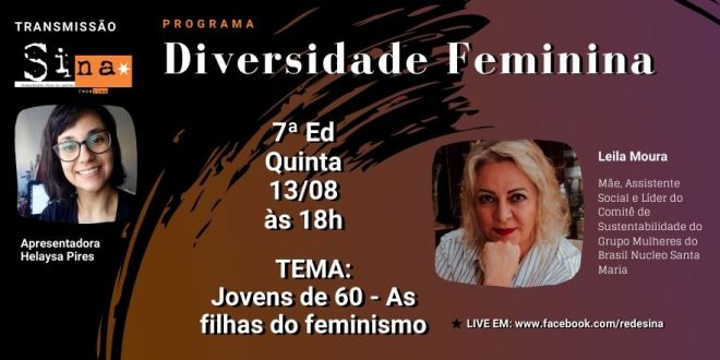 Nesta quinta-feira, 13 de Agosto, o Diversidade Feminina traz o tema JOVENS DE 60 – AS FILHAS DO FEMINISMO na Live Ao vivo às 18h. O que move as ações feministas é ainda a busca de mulheres pelos seus direitos como cidadã, independente do homem. Este é ponto de partida dos debates de sobre igualdade gênero que cada vez mais toma espaço e se diversifica em nossa sociedade. Porém, há certa distância entre os avanços teóricos e os práticos. E um dos fatores que contribuem significativamente para essa distância são os processos geracionais. Nesse programa a diversidade feminina será no nível geracional. Vamos conversar sobre como estão as mulheres de 60 anos hoje, as primeiras filhas do feminismo que, muitas vezes, estiveram dando passos solitários em espaços antes acessíveis apenas aos homens. A diversidade dessa vez será geracional e teremos uma convidada que atuou como assistente social e virá partilhar conosco suas vivências. O programa é transmitido pelo Facebook da Rede Sina (www.facebook.com/redesina/).