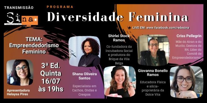 Nesta quinta-feira, 16 de Julho, o Diversidade Feminina traz o tema Empreendedorismo Feminino na Live Ao vivo às 19h. Empreender é o ato de realizar, decidir executar determinado projeto, ideia ou ação. Quando o qualificamos “feminino”, estamos lembrando da matriz patriarcal que molda nossa cultura e comportamentos. Sim, os desafios femininos são maiores do que os desafios dos nossos parceiros homens. A clássica dicotomia da casa, como lugar das mulheres, e da rua como lugar dos homens é uma das questões políticas importantes do contexto atual brasileiro. Uma das formas de violência passiva e estruturada contra a mulher que nos convidam a falar sobre como as mulheres que tem atuado em Santa Maria de forma empreendedora. O programa é transmitido pelo Facebook da Rede Sina (www.facebook.com/redesina/).