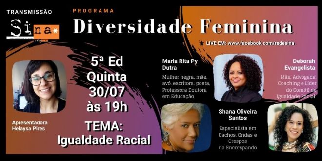 Nesta quinta-feira, 30 de Julho, o Diversidade Feminina traz o tema Igualdade Racial na Live Ao vivo às 19h. Nesta quinta-feira, 30 de Julho, o Diversidade Feminina traz o tema Igualdade Racial na Live Ao vivo às 19h. Diferente do racismo norte-americano, o brasileiro se camuflou no mito de uma democracia racial. A suposta convivência pacífica entre brancos, indígenas e africanos distorceu e segue distorcendo as desigualdades étnicas presentes neste país continental em que vivemos. Hoje, mais do que nunca estas questões estão expostas e nos desafiam no momento de pensar a igualdade racial. Por isso, chamamos três convidadas com diferentes experiências para falar sobre este assunto conosco. O programa é transmitido pelo Facebook da Rede Sina (www.facebook.com/redesina/).