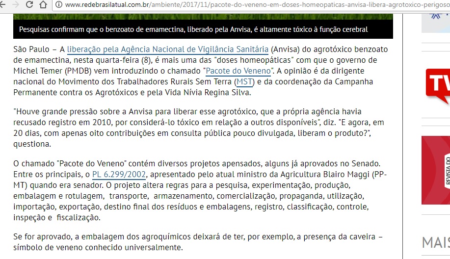 Enquanto isso parece que o governo discute a aprovação de um “pacote veneno” onde mais pesticidas podem ser liberados.
