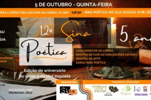 12ª Sina Poética, acontece nesta quinta, dia 5 de outubro, a partir das 19h30 no Old School Pub. A SINA POÉTICA chega a sua 12ª edição completando 5 anos. A edição de outubro é a segunda em parceria com a Festa Literária de Santa Maria- FLISM, que está com programação …