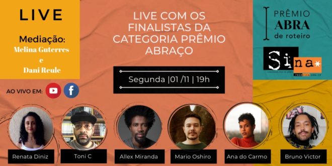 01/11 – Segunda-feira – 19h Sina em Pauta: BATE-PAPO COM FINALISTAS DO PRÊMIO ABRAÇO / PRÊMIO ABRA Mediação: Melina Guterres e Dani Reule Convidados: Allex Miranda, Ana do Carmo, Bruno Victor, Mario Oshiro, Toni C, Renata Diniz Transmissão em: www.facebook.com/autoresroteiristas www.facebook.com/redesina www.youtube.com/redesina e nesta publicação Nesta segunda, 1, às 19h, a ABRA – Associação Brasileira …