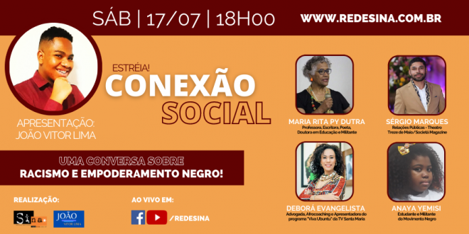 17/07 – Sáb – 18h00 Conexão Social: Racismo e Empoderamento Negro Programa mensal – Edição n° 01 Apresentação de João Vitor Lima Convidados: Maria Rita Py Dutra, Deborá Evangelista, Sérgio Marques e Anaya Yemisi Transmissão em: https://www.facebook.com/redesina https://www.youtube.com/redesina e nesta publicação   Neste sábado, dia 17, às 18h, João Vitor …