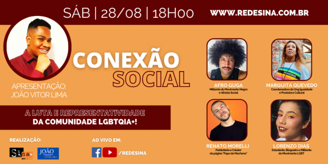28/08 – Sáb – 18h00 Conexão Social: A Luta e Representatividade da Comunidade LGBTQIA+ Programa mensal – Edição n° 02 Apresentação de João Vitor Lima Convidados: Marquita Quevedo, Afro Guga, Renato Morelli e Lorenzo Dias Transmissão em: https://www.facebook.com/redesina https://www.youtube.com/redesina e nesta publicação   No sábado, 28, às 18h no Conexão …