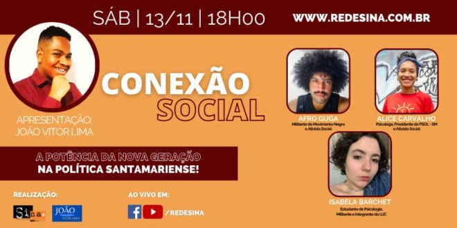 13/11 – Sáb – 18h00 Conexão Social: A Potência da Nova Geração na Política Santamariense Programa mensal – Edição n° 03 Apresentação de João Vitor Lima Convidados: Alice Carvalho, Afro Guga e Isabela Barchet Transmissão em: https://www.facebook.com/redesina https://www.youtube.com/redesina e nesta publicação No sábado, 13, às 18h no Conexão Social, apresentado por …