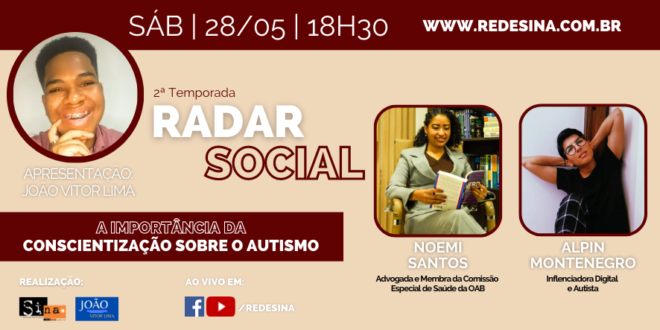 28/05 – Sáb – 18h30 Radar Social: Importância da Conscientização Sobre o Autismo Programa mensal – Edição n° 04 Apresentação de João Vitor Lima Convidadas: Noemi Santos e Alpin Montenegro Transmissão em: https://www.facebook.com/redesina https://www.youtube.com/redesina e nesta publicação Neste sábado, dia 28, às 18h30, o comunicador João Vitor Lima estreia na Rede …