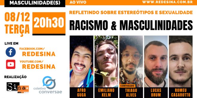 08/12– terça – 20h30 Masculinidade(s) Apresentado por: Afro Guga, Emiliano Kelm, Lucas Motta Brum, Romeu Casarotto Convidado: Thiago Alves A cultura do estupro: estupro culposo não existe! Próximo programa em: 22/12 Live em: www.facebook.com/redesina www.youtube.com/redesina www.redesina.com.br No debate sobre o racismo cresce a consciência sobre a importância de haver a …