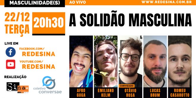 22/12 – terça – 20h30 Masculinidade(s) Apresentado por: Afro Guga, Emiliano Kelm, Lucas Motta Brum, Romeu Casarotto Convidado: Otávio Rosa A Solidão Masculina Live em: www.facebook.com/redesina www.youtube.com/redesina www.redesina.com.br Se homens muitas vezes não encontram um espaço seguro para falar sobre suas emoções nem com seus amigos mais próximos, …