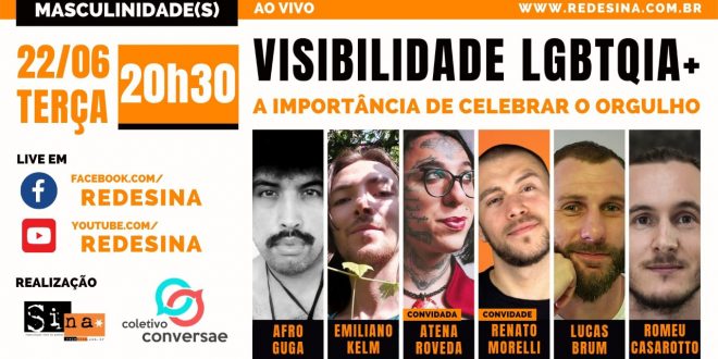 22/06 – Terça-feira – 20h30 Masculinidade(s) Apresentado por: Afro Guga, Emiliano Kelm, Lucas Motta Brum, Romeu Casarotto Participantes: Atena Roveda e Renato Morelli Visibilidade LGBTQIA+: A importância de celebrar o orgulho Live em: www.facebook.com/redesina www.youtube.com/redesina www.redesina.com.br Neste Junho, mês do Orgulho LGBTQIA+, te convidamos para uma conversa sobre a …
