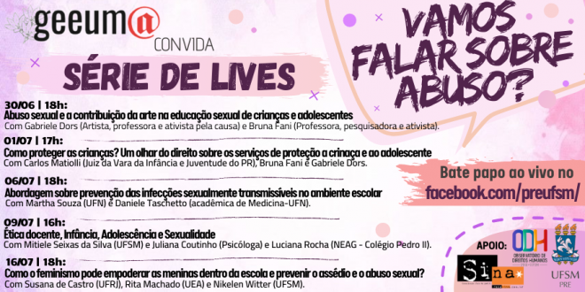 5ª LIVE: Como o feminismo pode empoderar as meninas dentro da escola e prevenir o assédio e o abuso sexual? https://www.facebook.com/preufsm/videos/1207068299634183 4ª LIVE: Ética docente, Infância, Adolescência e Sexualidade. https://www.facebook.com/preufsm/videos/351624359158272/ 3 ª LIVE: Abordagem sobre prevenção das infeções sexualmente transmissíveis no ambiente escolar. https://www.facebook.com/preufsm/videos/286706259409553/ 2ª LIVE: Como …