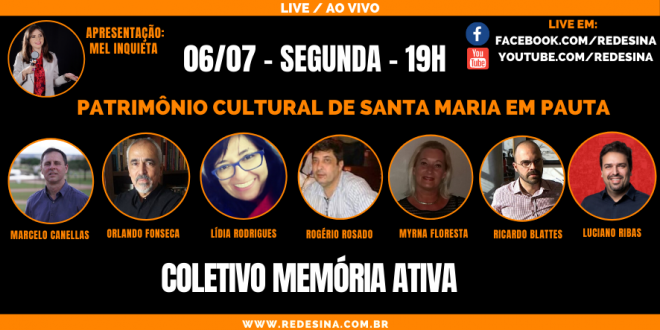 06/07 – Segunda-feira – 19h Apresentação Mel Inquieta Patrimônio Cultural de Santa Maria-RS em pauta Live com Coletivo Memória Ativa Saiba mais sobre o Coletivo: https://redesina.com.br/category/memoriaativa/ Saiba sobre os manifestos recentes sobre a Gare: Manifestos pela preservação de espaço público destinado à cultura na Gare Live no face: Compartilhe