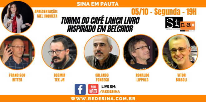 05/10 – Segunda-feira – 19h – LIVE SINA EM PAUTA Lançamento do livro “Ano passado eu morri… – Histórias de quando havia galos noites e quintais” da Turma do Café Apresentação: Mel Inquieta (Melina Guterres) Convidados: Francisco Ritter, Odemir Tex Jr, Orlando Fonseca, Ronaldo Lippold, Vitor Biasoli Live em: www.facebook.com/redesina …