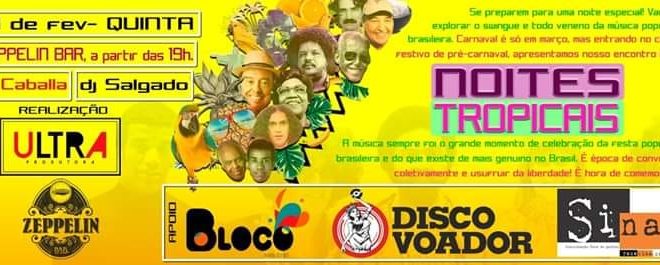 A Ultra Produtora, do Sandor Mello, em parceria com o Zeppelin Bar e apoio da Rádio Bloco, Disco Voador e Rede Sina promove Noites Tropicais, onde vai rolar muita música brasileira com os DJs Marcelo Cabala e Salgado (Sandor Mello). A primeira Noite Tropical acontece nessa quinta, 21, a partir das 19 horas no Zeppelin Bar