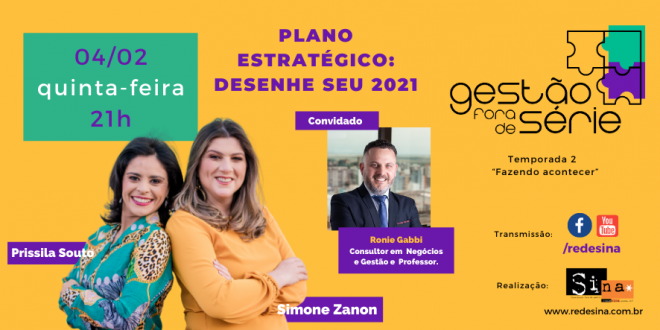 Para auxiliar você na construção deste plano estratégico, Simone Zanon e Prissila Souto recebem nesta quinta-feira, 04/02 às 21h o Consultor e Professor Ronei Gabi.